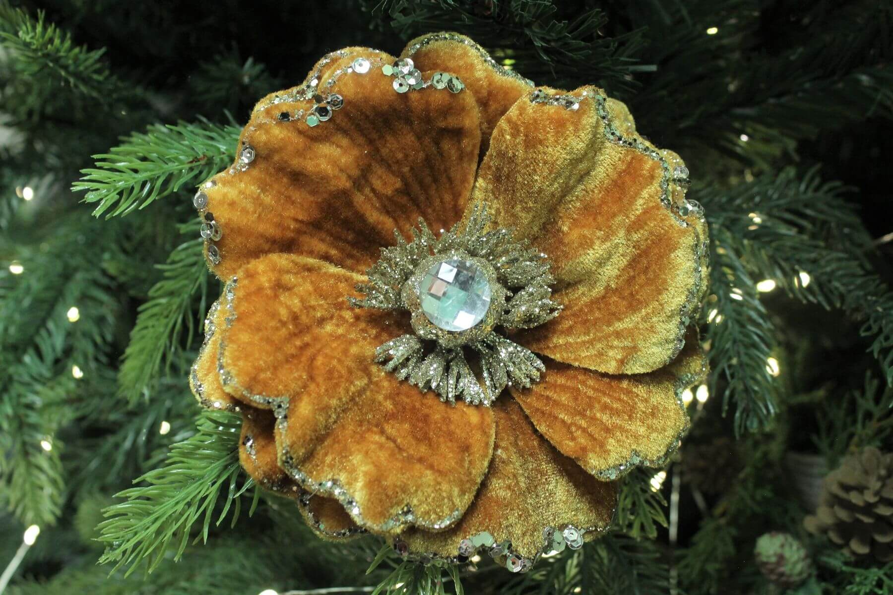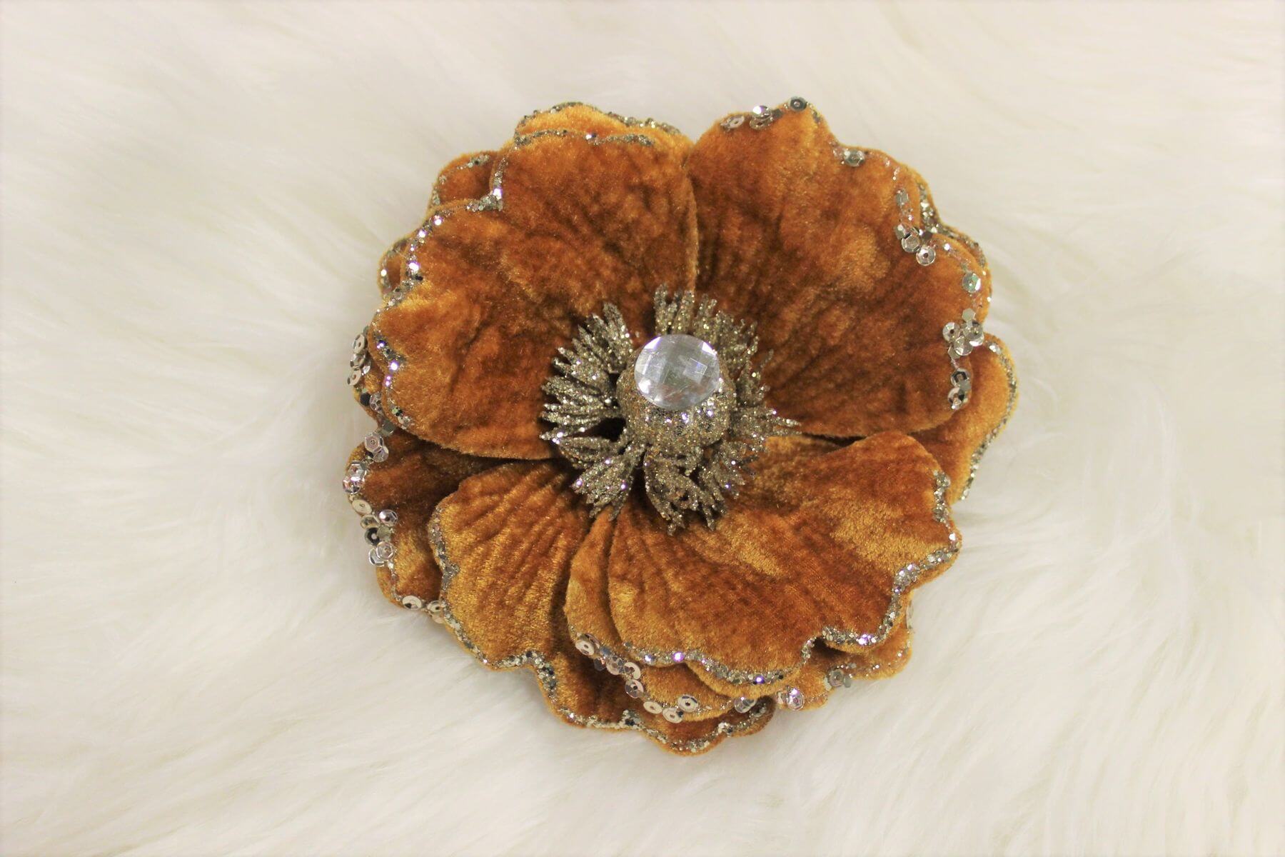 Medená zamatová magnólia je originálna ozdoba na vianočný stromček. Tento vianočný kvet môžete použiť aj ako dekoráciu do vianočných aranžmánov a adventných vencov. Na zadnej strane sa nachádza štipec pre jednoduché uchopenie.