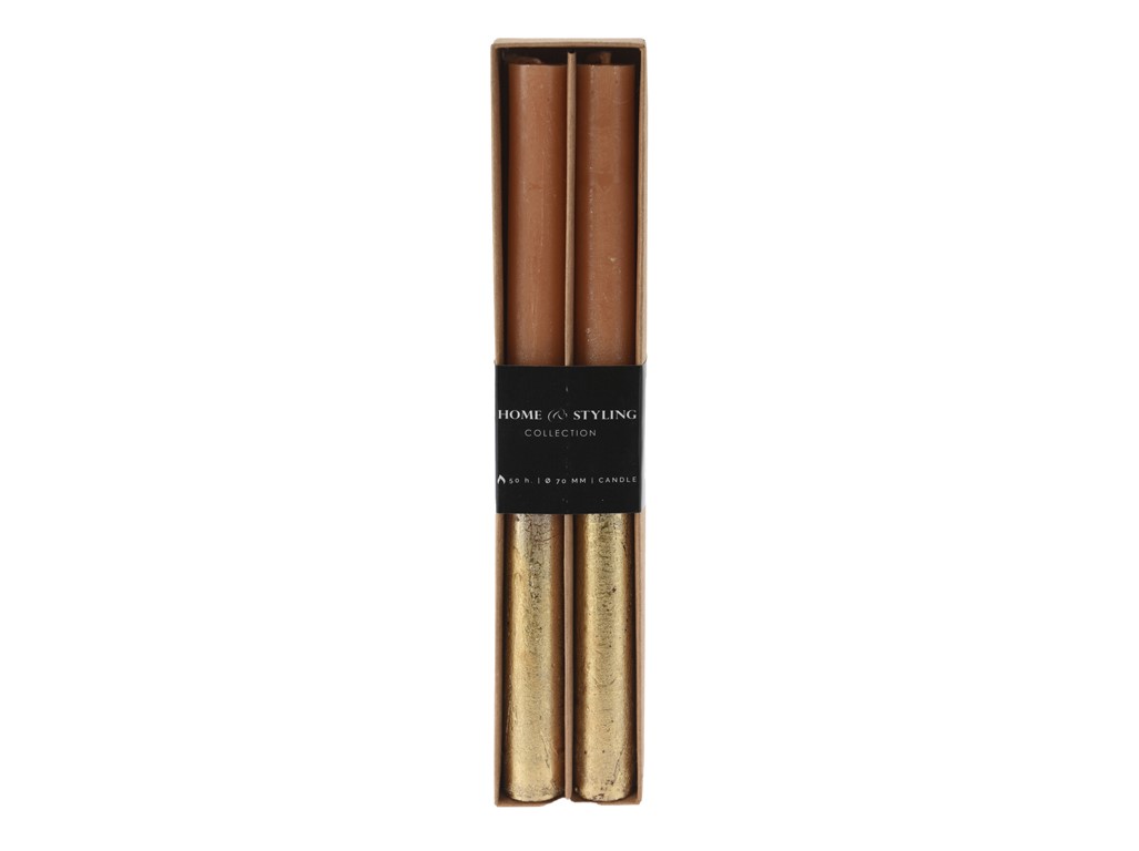 Rustikálne sviečky v sade po dvoch kusoch potešia každého milovníka jedinečných dekorácií. Každá sviečka má rozmer 21x250 mm a je ozdobená elegantnou metalickou povrchovou úpravou od polovice sviečky. Sú ideálne do svietnikov, na sviatočný stôl, oslavy či romantické večery. Svojím dizajnom zaujmú na prvý pohľad a pomôžu vytvoriť príjemnú atmosféru v každej miestnosti. Vhodné aj ako vkusný darček.