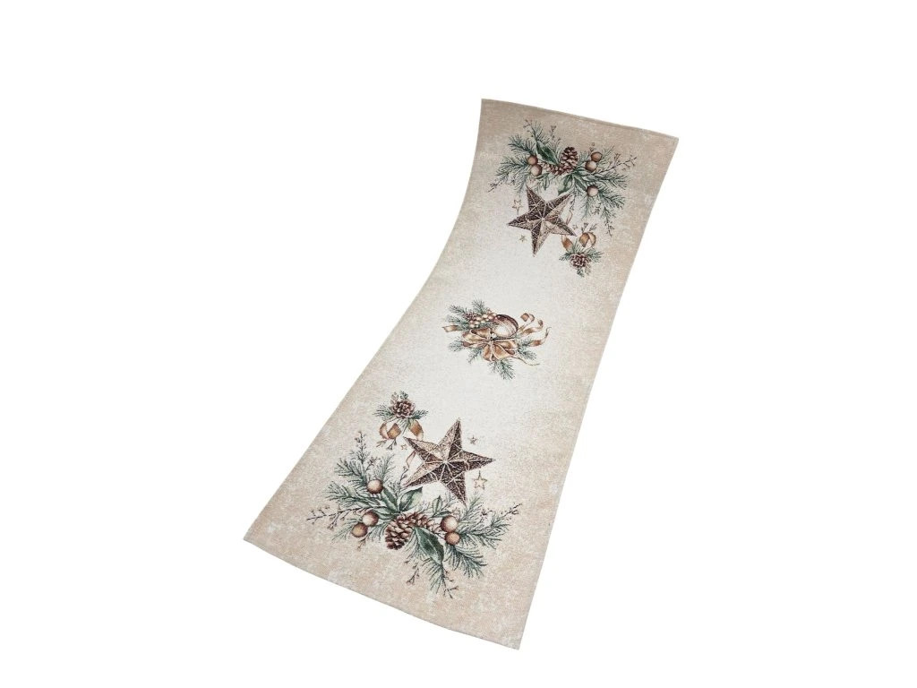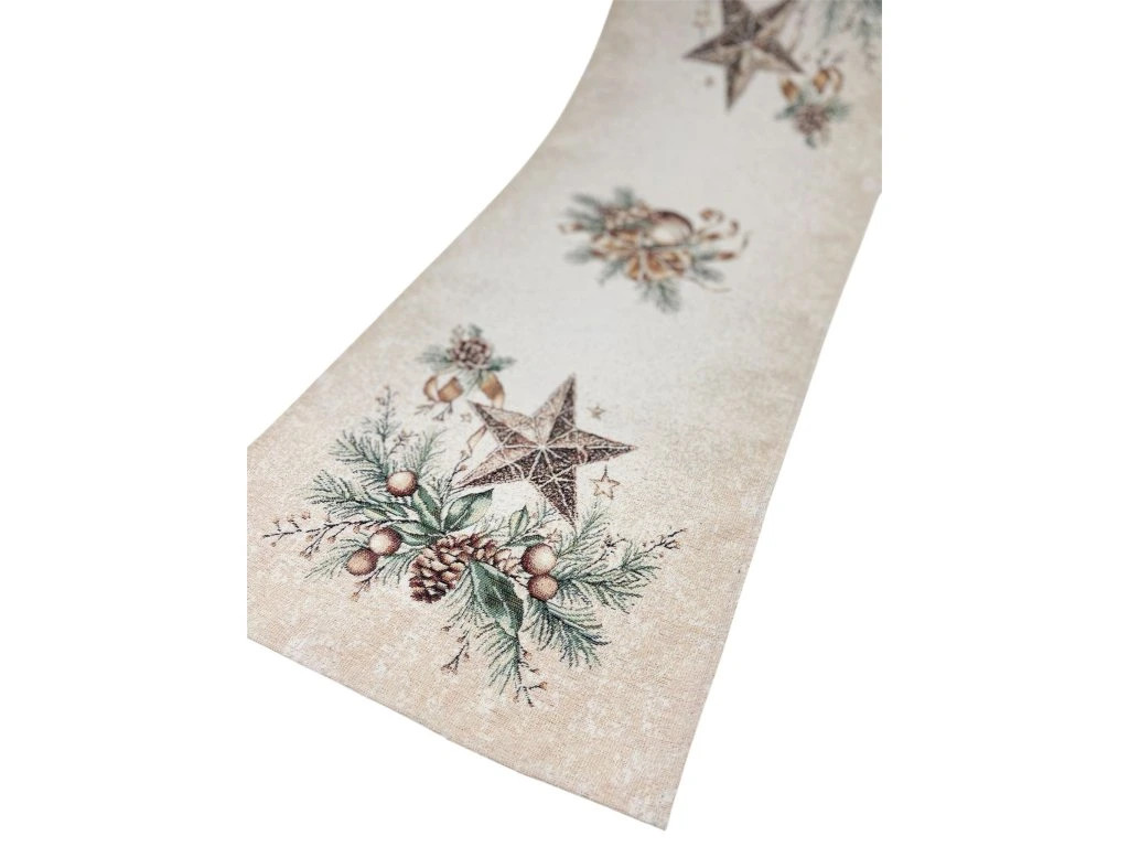 Béžový behúň s vianočným motívom je ideálny na ozdobenie vášho interiéru počas Vianoc. Krásny motív vianočnej hviezdy s ihličím vytvorí atmosféru pohody. Behúň je príjemný na dotyk.