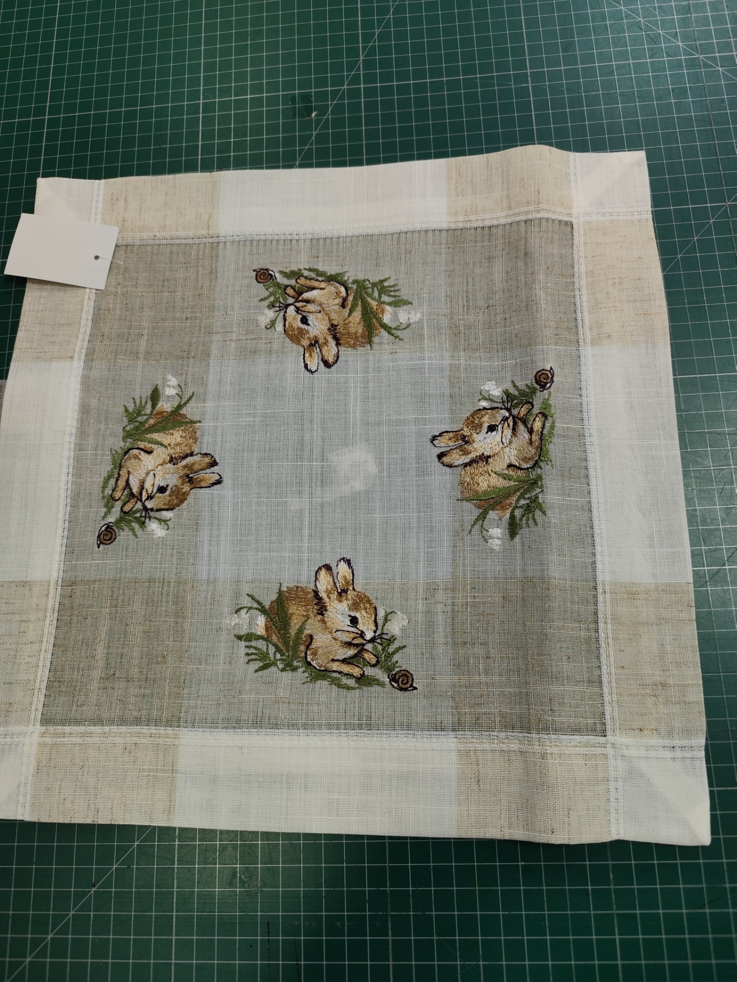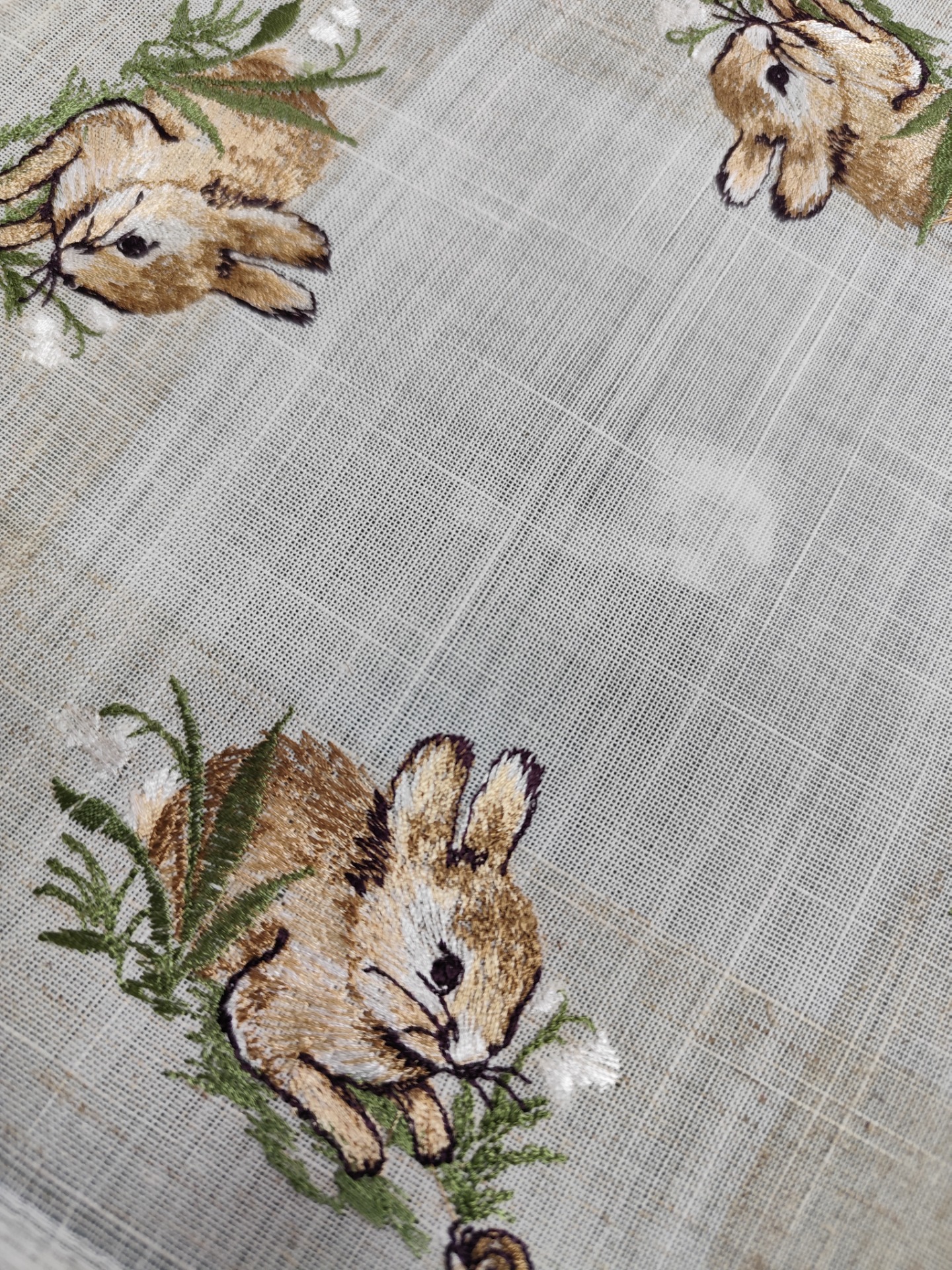 Vneste do svojho domova slávnostnú atmosféru Veľkej noci s týmto ľanový prestieraním zdobeným roztomilým vyšívaným motívom hnedého veľkonočného zajačika.