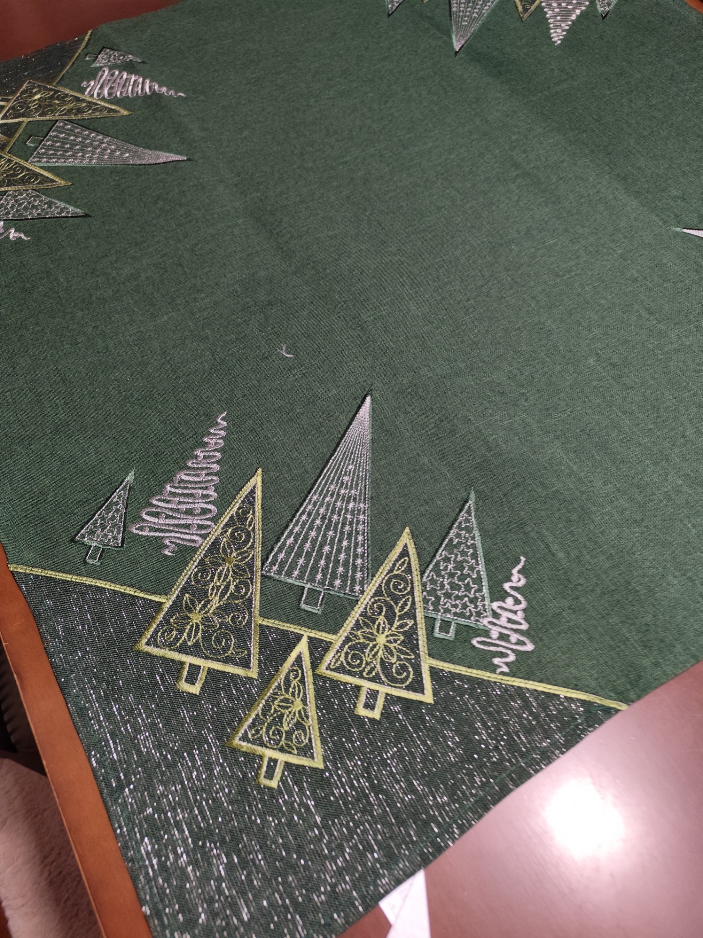 Luxusný textilný obrus vyšívaný metalickou niťou na zelenom podklade dodá vášmu vianočnému prestieraniu rozprávkovú sviatočnú atmosféru. Výšivka je po celom obvode obrusa. V ponuke aj dekoratívnu štólu 40cm x 140cm