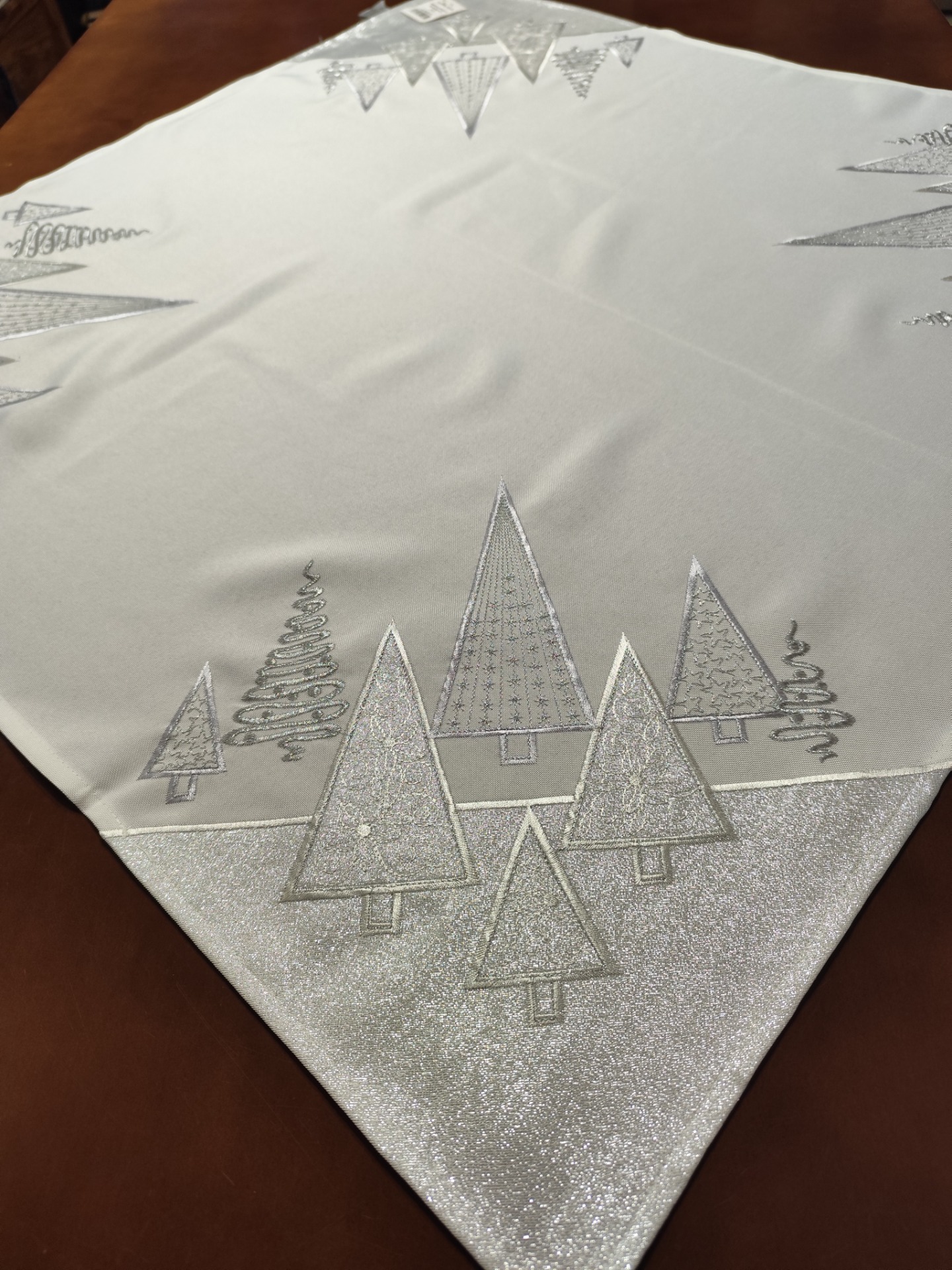 Luxusný textilný obrús vyšívaný metalickou niťou na bielo striebornom podklade dodá vášmu vianočnému prestieraniu rozprávkovú sviatočnú atmosféru. Výšivka je po celom obvode obrusa. V ponuke aj dekoratívnu štólu 40cm x 140cm
