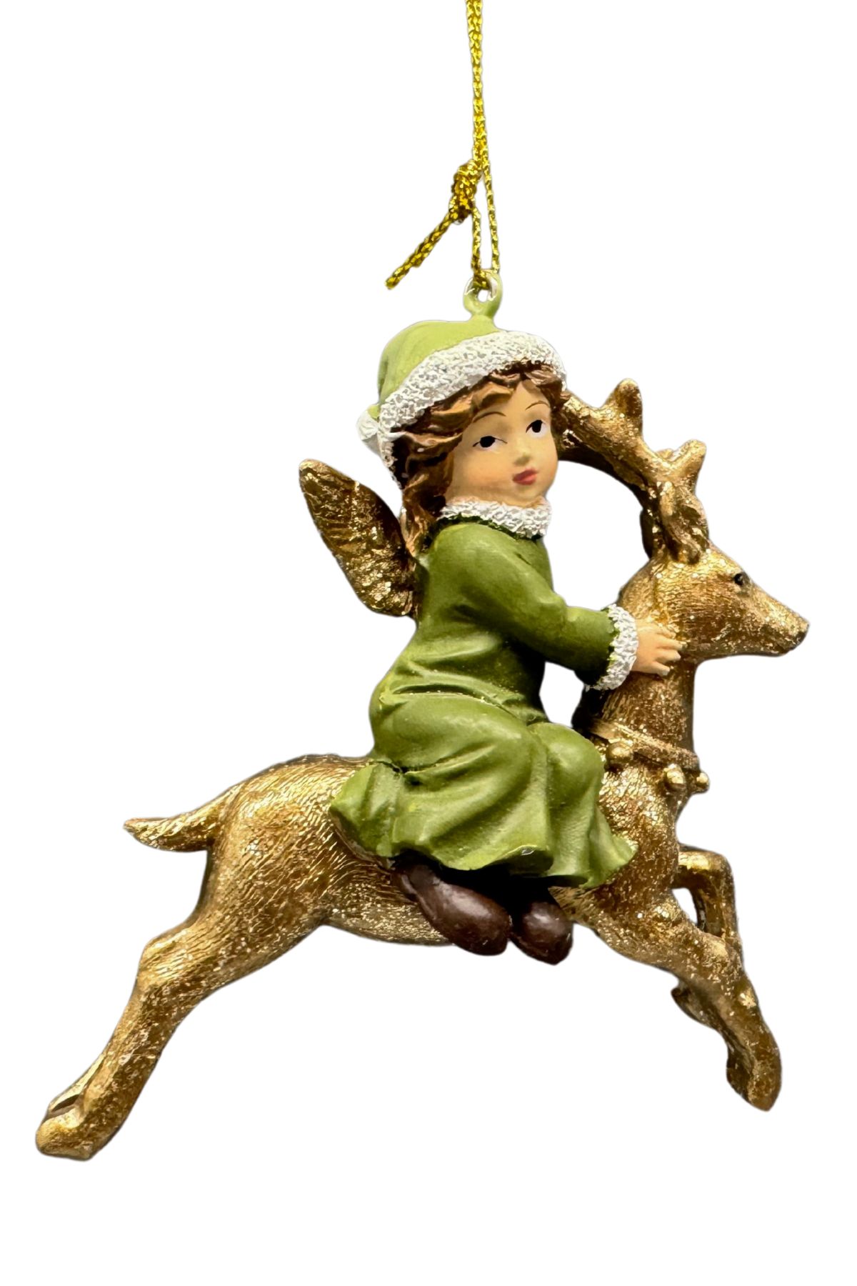 Zeleno zlatý anjelik s jeleňom je ozdoba vhodná na zavesenie na vianočný stromček. Taktiež ju môžete použiť do rôznych vianočných dekorácií a aranžmánov.